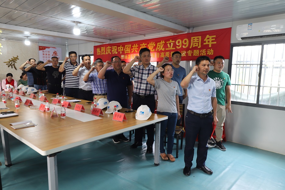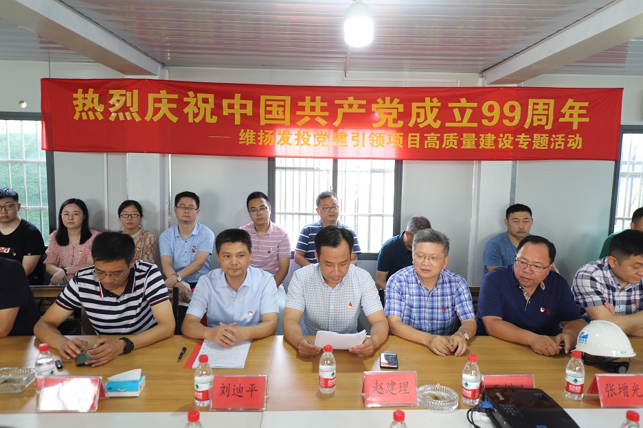 系列活動(dòng)二:黨建引領(lǐng)項(xiàng)目高質(zhì)量建設(shè)專題活動(dòng) 6月30日下午,公司黨支部組織公司全體黨員、預(yù)備黨員、發(fā)展對(duì)象、入黨積極分子前往創(chuàng)業(yè)路(真州路-揚(yáng)冶路)道路工程項(xiàng)目部,開展慶祝建黨99周年專題活動(dòng)。 本次活動(dòng)共有五項(xiàng)議程:一是聽取項(xiàng)目部匯報(bào);二是維揚(yáng)發(fā)投與華泰路橋有關(guān)負(fù)責(zé)人就創(chuàng)業(yè)路項(xiàng)目建設(shè)的安全生產(chǎn)、揚(yáng)塵管控、質(zhì)量控制、建設(shè)進(jìn)度等方面做了詳細(xì)交流;三是由公司黨支部書記、董事長劉迪平同志帶領(lǐng)全體黨員重溫入黨誓詞;四是由劉迪平同志為項(xiàng)目部黨員代表授黨員突擊隊(duì)隊(duì)旗;五是公司黨支部書記講話。 劉迪平強(qiáng)調(diào):“我們要立足項(xiàng)目高質(zhì)量建設(shè),強(qiáng)化黨建引領(lǐng),帶動(dòng)項(xiàng)目前期工作更加精心,方案設(shè)計(jì)更加精當(dāng),工程造價(jià)更加精準(zhǔn),項(xiàng)目管理更加精細(xì),維護(hù)保養(yǎng)更加精良,讓每一個(gè)維揚(yáng)發(fā)投建設(shè)項(xiàng)目都打上‘精品’的印記。”